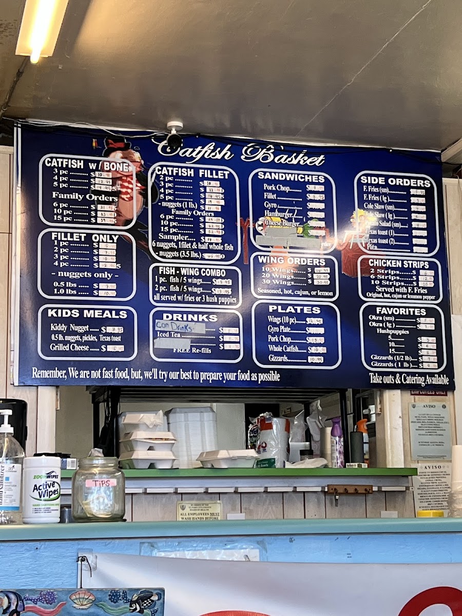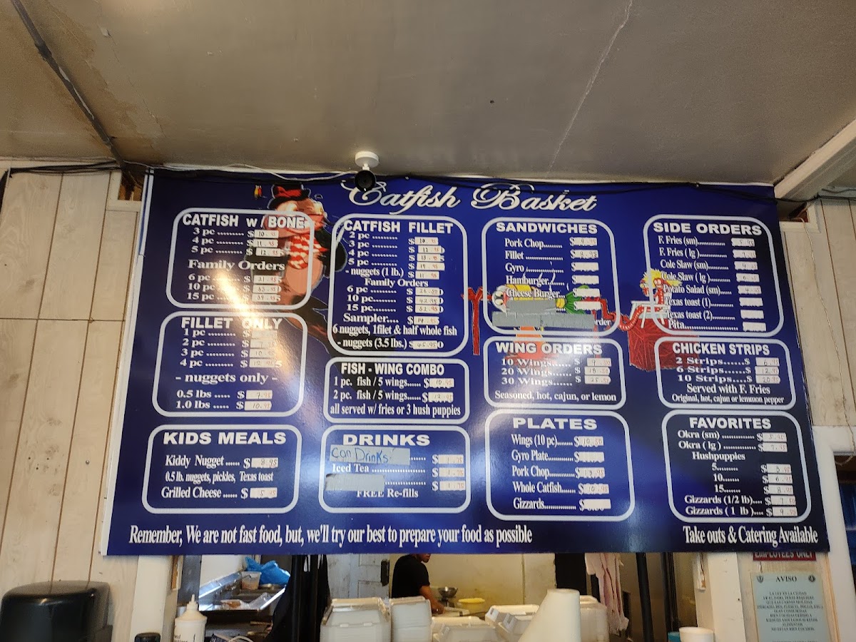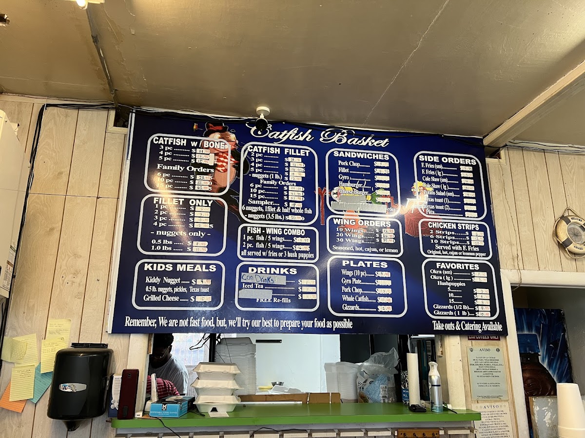 The menu features a variety of seafood and complementary dishes, centered around fried catfish and shrimp offerings. It is organized into several categories to accommodate different dining preferences, including seafood combos, chicken options, side orders, and beverages.
