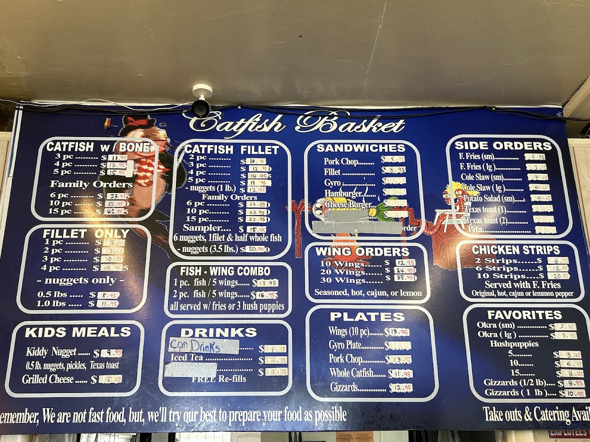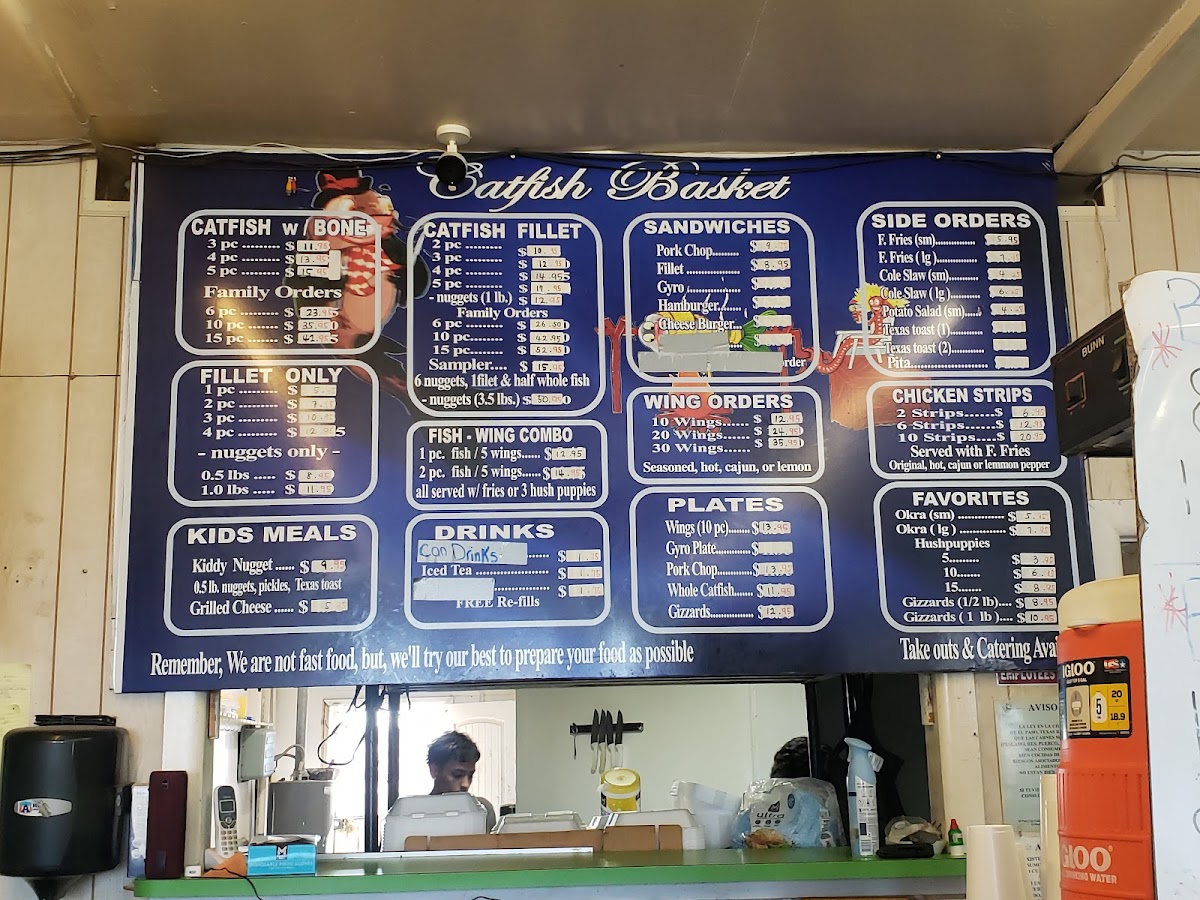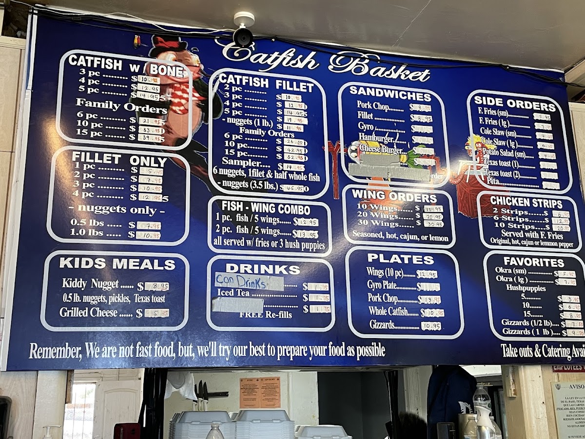 The menu features a variety of seafood and complementary dishes, centered around fried catfish and shrimp offerings. It is organized into several categories to accommodate different dining preferences, including seafood combos, chicken options, side orders, and beverages.
